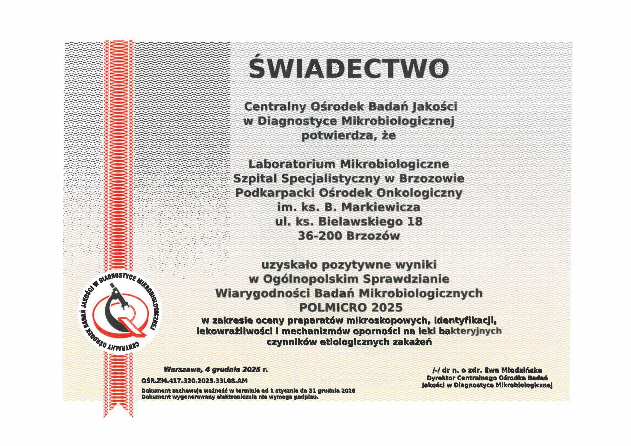 Laboratorium Mikrobiologiczne dysponuje nowoczesną, specjalistyczną aparaturą diagnostyczną m.in. VITEK MS PRIME wykorzystujący metodę spektometrii mas do identyfikacji drobnoustrojów, VITEC 2 Compact do automatycznej identyfikacji i oznaczania lekowrażliwości, analizator do szybkiej diagnostyki zakażeń metodą PCR, BacT/ALERT 3D 240 do automatycznego monitorowania posiewów krwi i płynów ustrojowych.