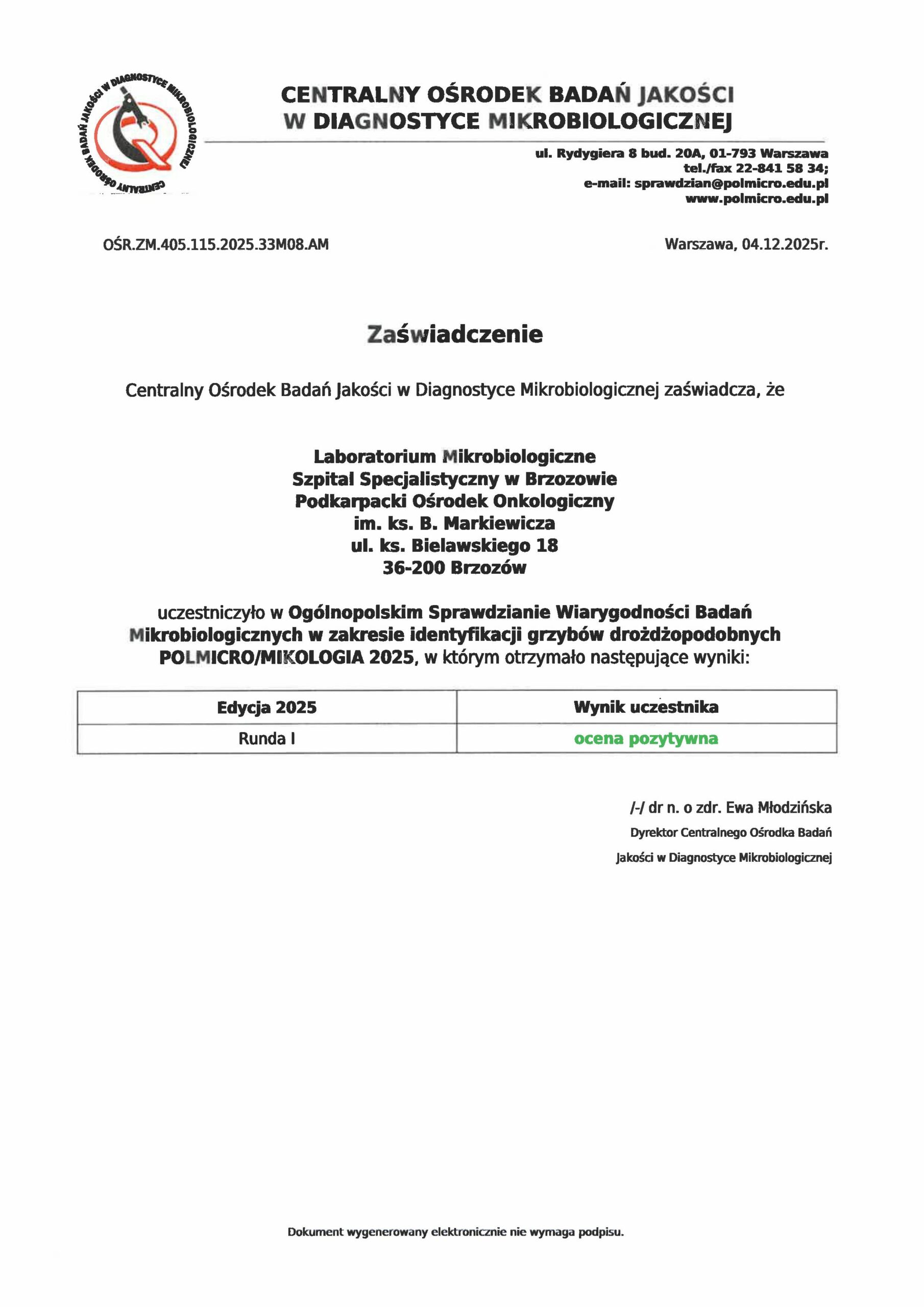 poniedziałek – piątek w godz. 12:00–14:30 na podstawie upoważnienia do odbioru wyników.