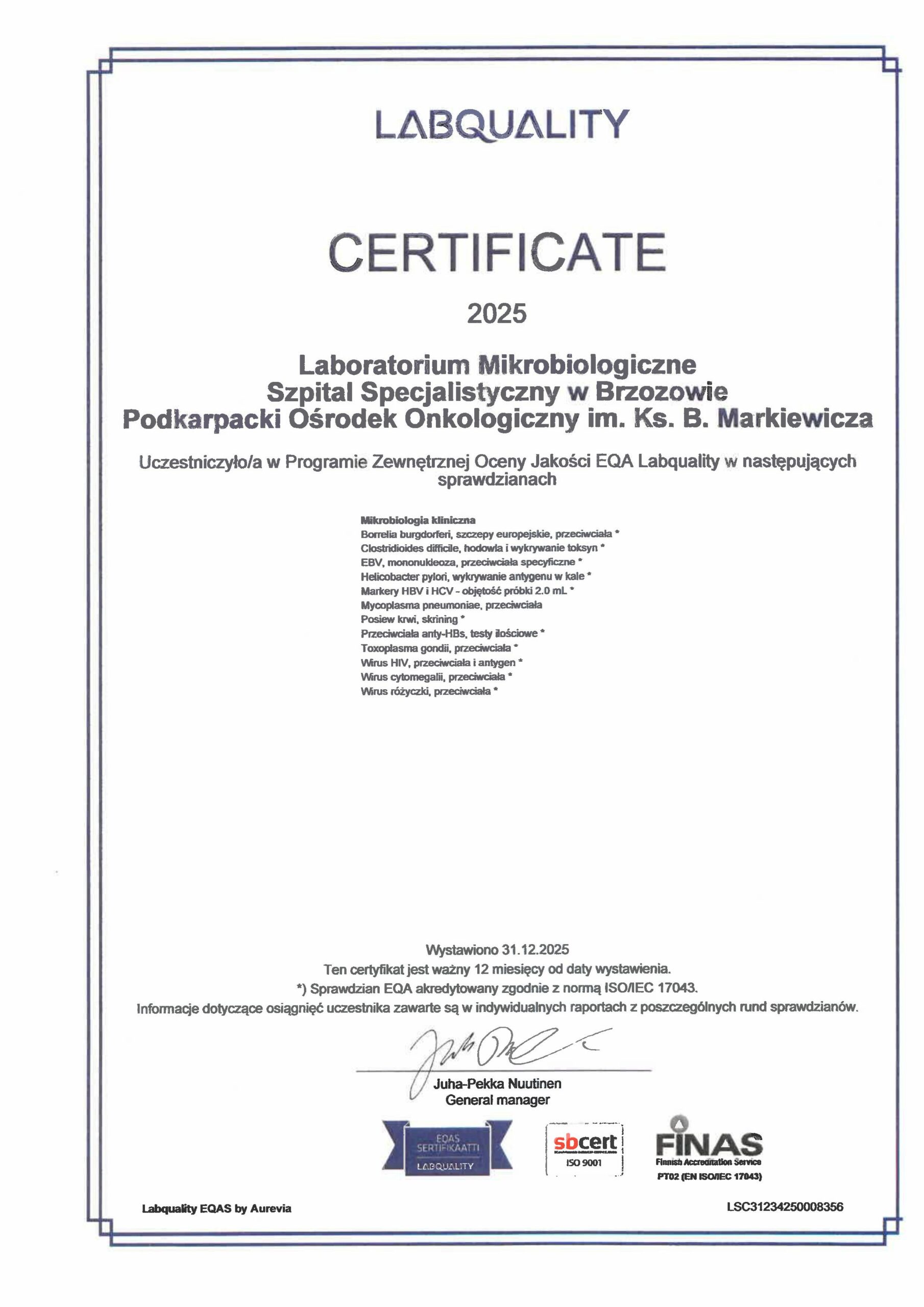 Wykonujemy badania na rzecz jednostek Szpitala Specjalistycznego w Brzozowie, kontrahentów zewnętrznych i na zlecenie pacjenta. Badania podlegają krajowym i międzynarodowym programom kontroli zewnętrznej, które są potwierdzone certyfikatami oraz kontroli wewnętrznej.